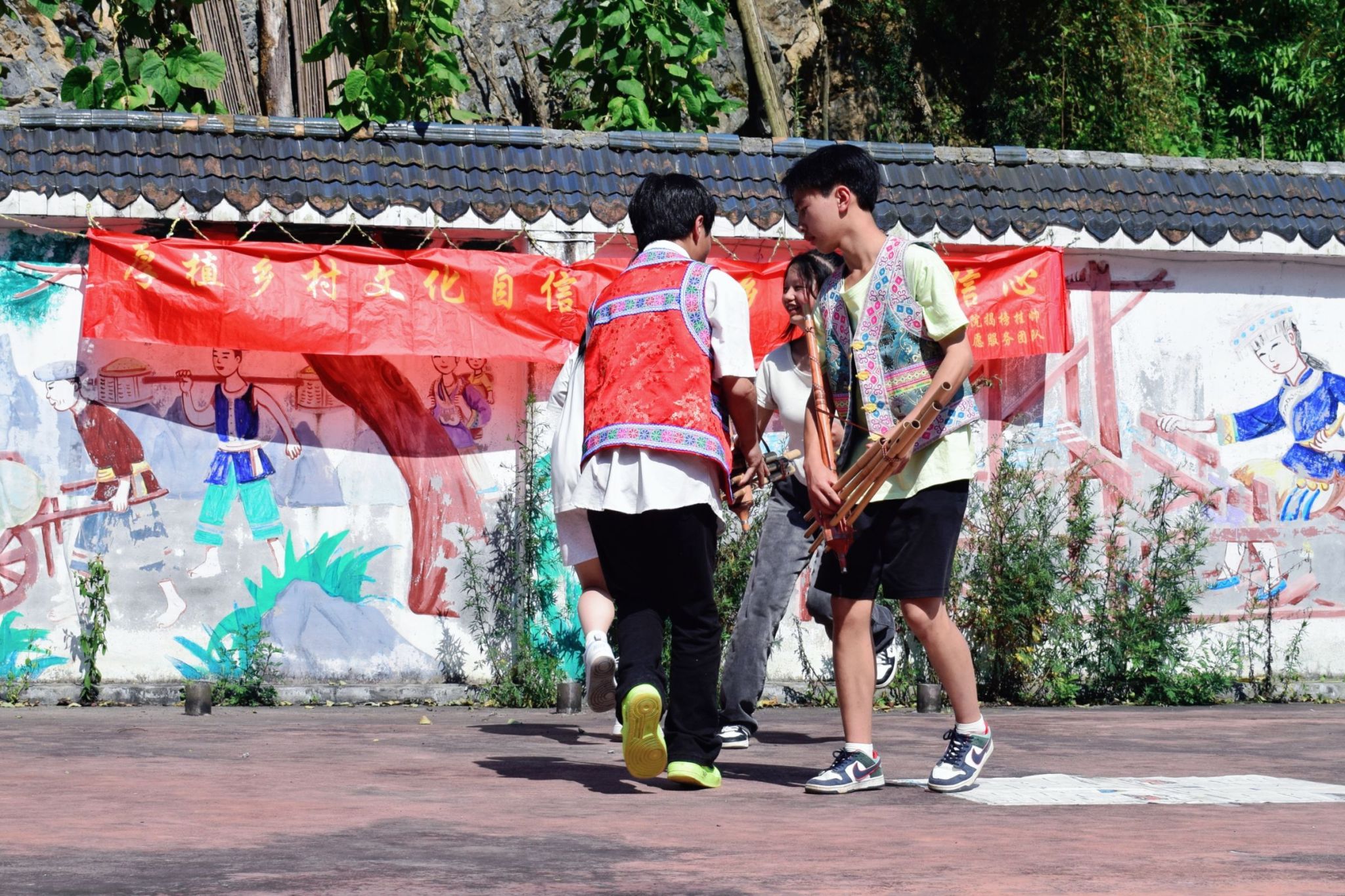 仙峰苗族乡拥有自己独特的文化和传统。苗族非遗作为民族文化的瑰宝,不仅展现了苗族人民的智慧和创造力,也为团队成员提供了研究苗族历史、文化和艺术的重要窗口。志愿者们对苗族服饰、芦笙舞两类非物质文化遗产展开研究。在活动过程中,团队成员与当地学生共同研究苗族服饰的制作工艺、图案寓意以及穿着习俗,并探讨如何在现代生活中更好地传承和发扬这一传统服饰文化。在芦笙舞的共学与合作环节,学生们携带自己的乐器芦笙,教授志愿者们跳芦笙舞。实践团成员与当地学生一起舞动身姿、吹奏乐器,深刻体验了苗族文化的魅力。